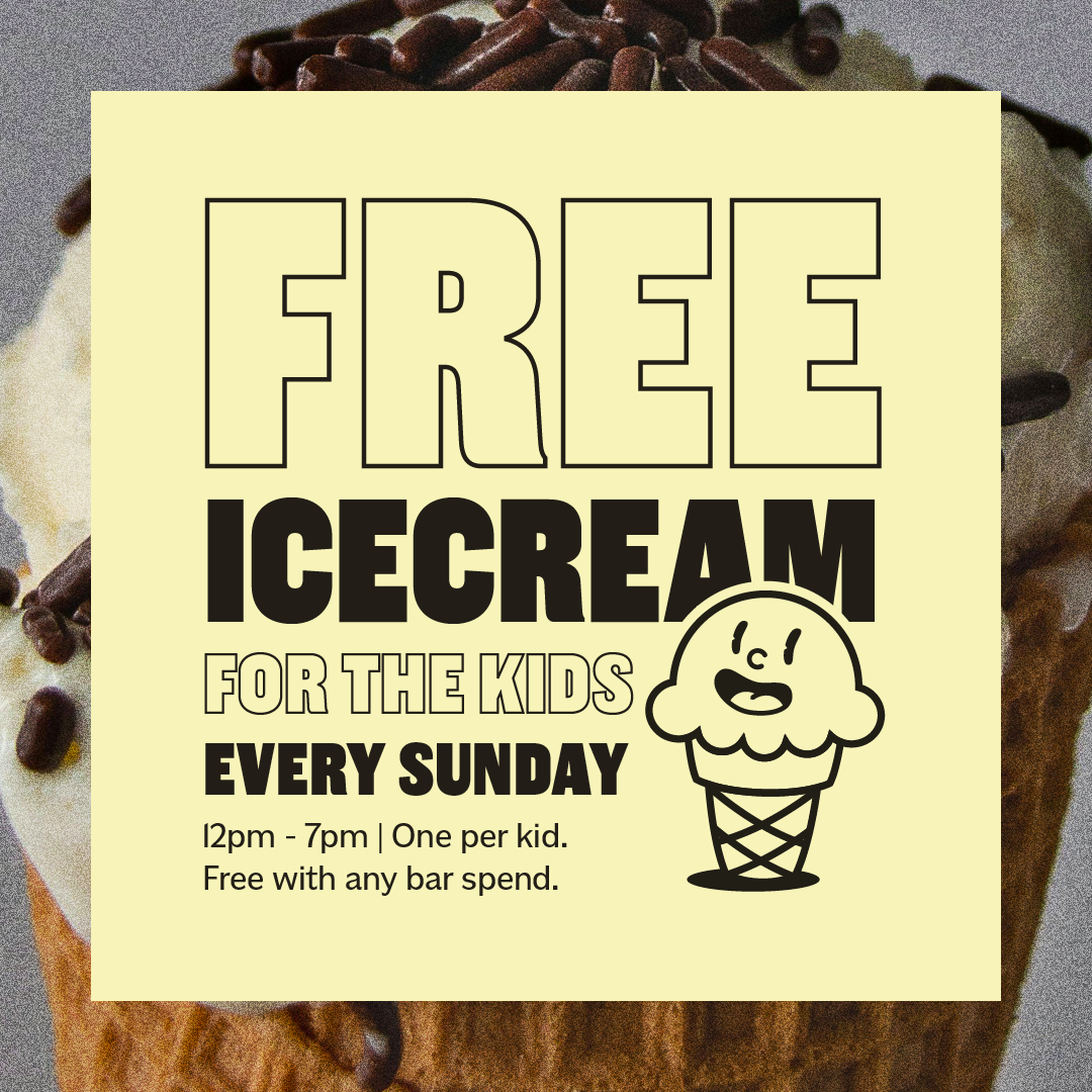 Every Sunday grab a free ice cream for the kids, with any bar purchase (one per child). A scoop of vanilla with 100s and 1000s and choice of sauce.